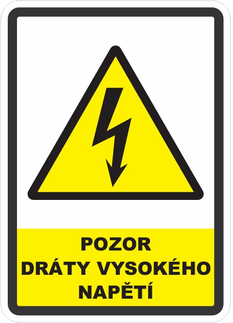 Cedulka Pozor dráty vysokého napětí upozorňuje na život ohrožující nebezpečí elektrického proudu v drátech, jde o varování před stykem, který může způsobit vážná zranění.